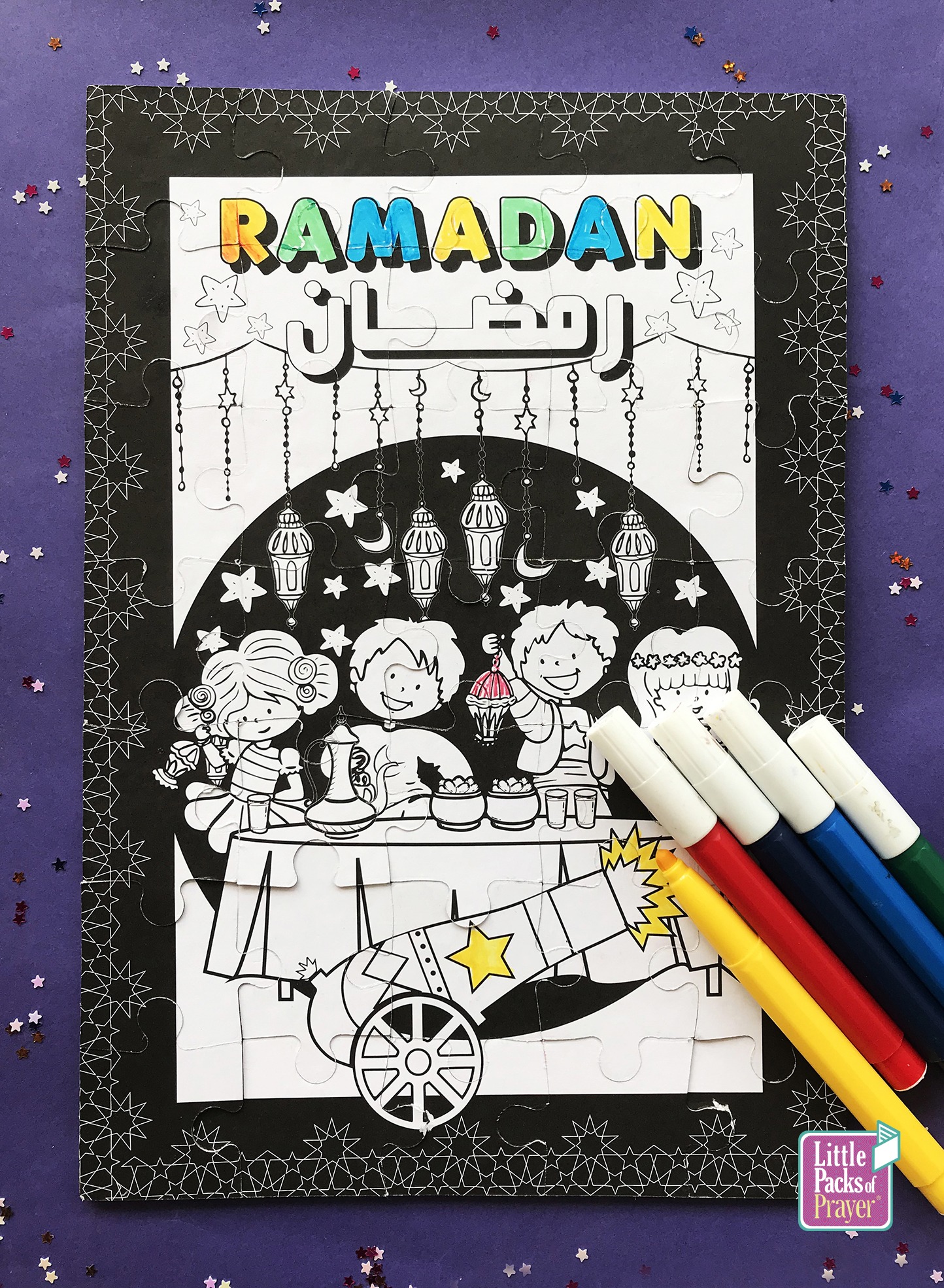 A colorful Ramadan night puzzle with a Lantern making craft introducing the idea of the joyful month of Ramadan to the little ones in the house.